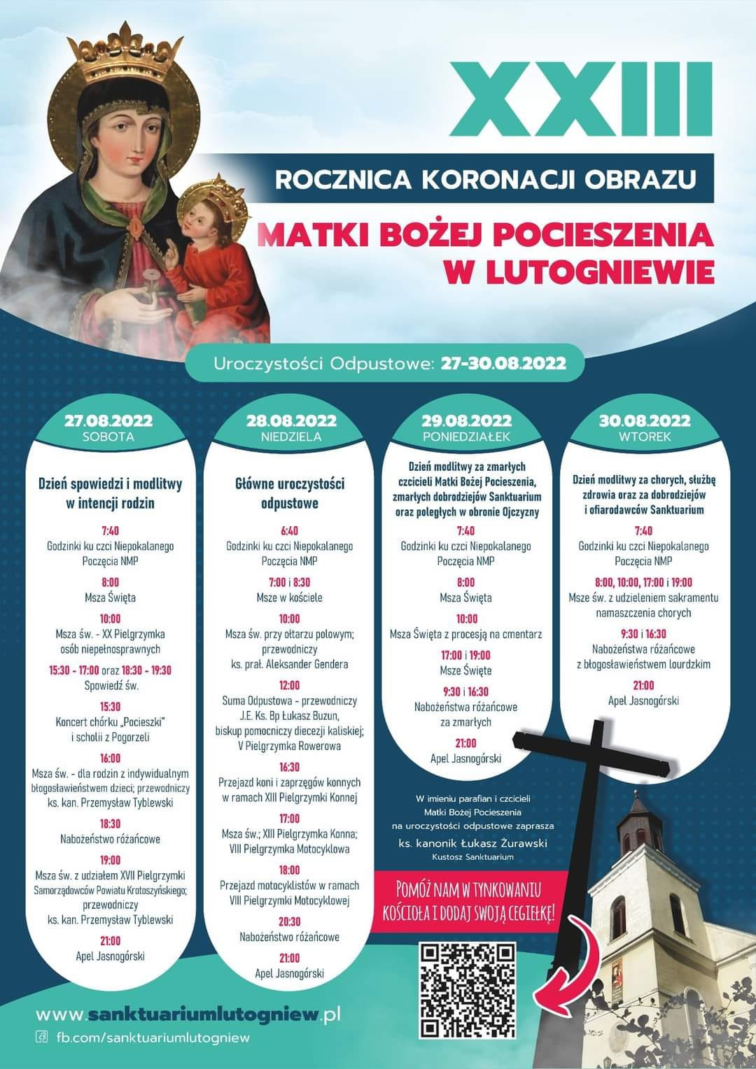 Zapraszamy na Uroczystości Odpustowe ku Czci Matki Bożej Pocieszenia w Lutogniewie 26.08.2022r.